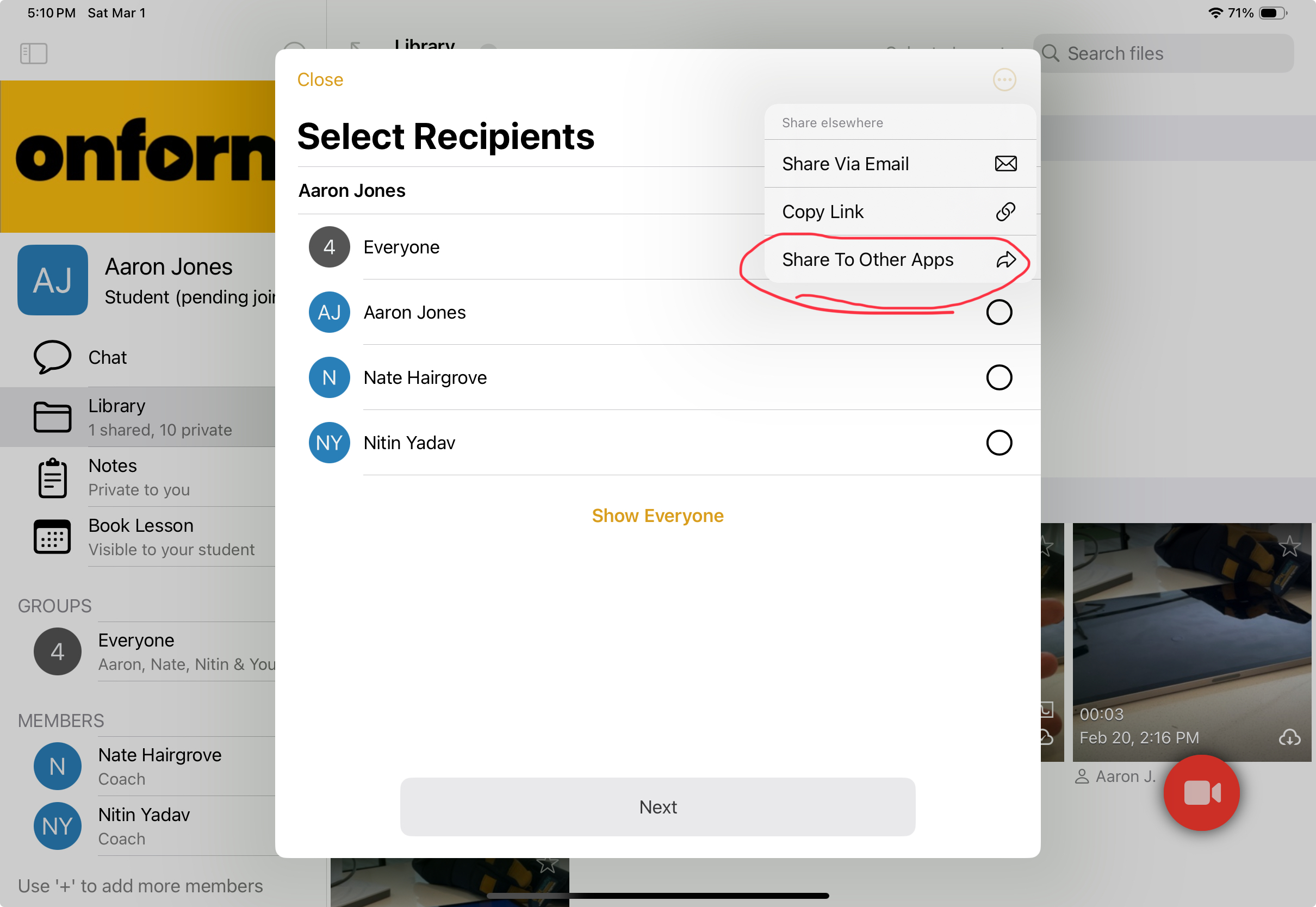 You can easily share a video outside of the Onform app. Just long press on a video thumbnail, then tap 'share' and then tap the more icon and tap 'share to other apps'. From here you can save the video to your camera roll or share directly to any other app.
