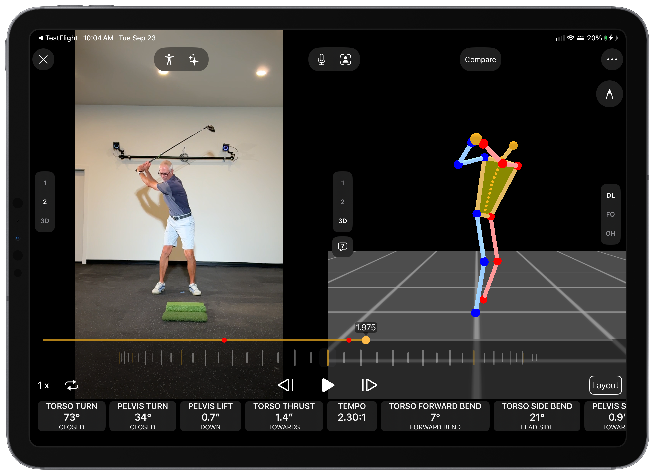 Onform 3D is a powerful way to visualize a golf swing and obtain objective data for key body metrics. We've worked to deliver a reliable solution that does not require an internet connection, takes around 10 seconds to compute on an iPhone 16 Pro and provides comparable data to much more expensive systems traditionally only available in a lab or indoor studio. 3D data is only available to coaches at this time, thus students/golfers will be able to visualize the 3D skeleton but won't have access to the data.