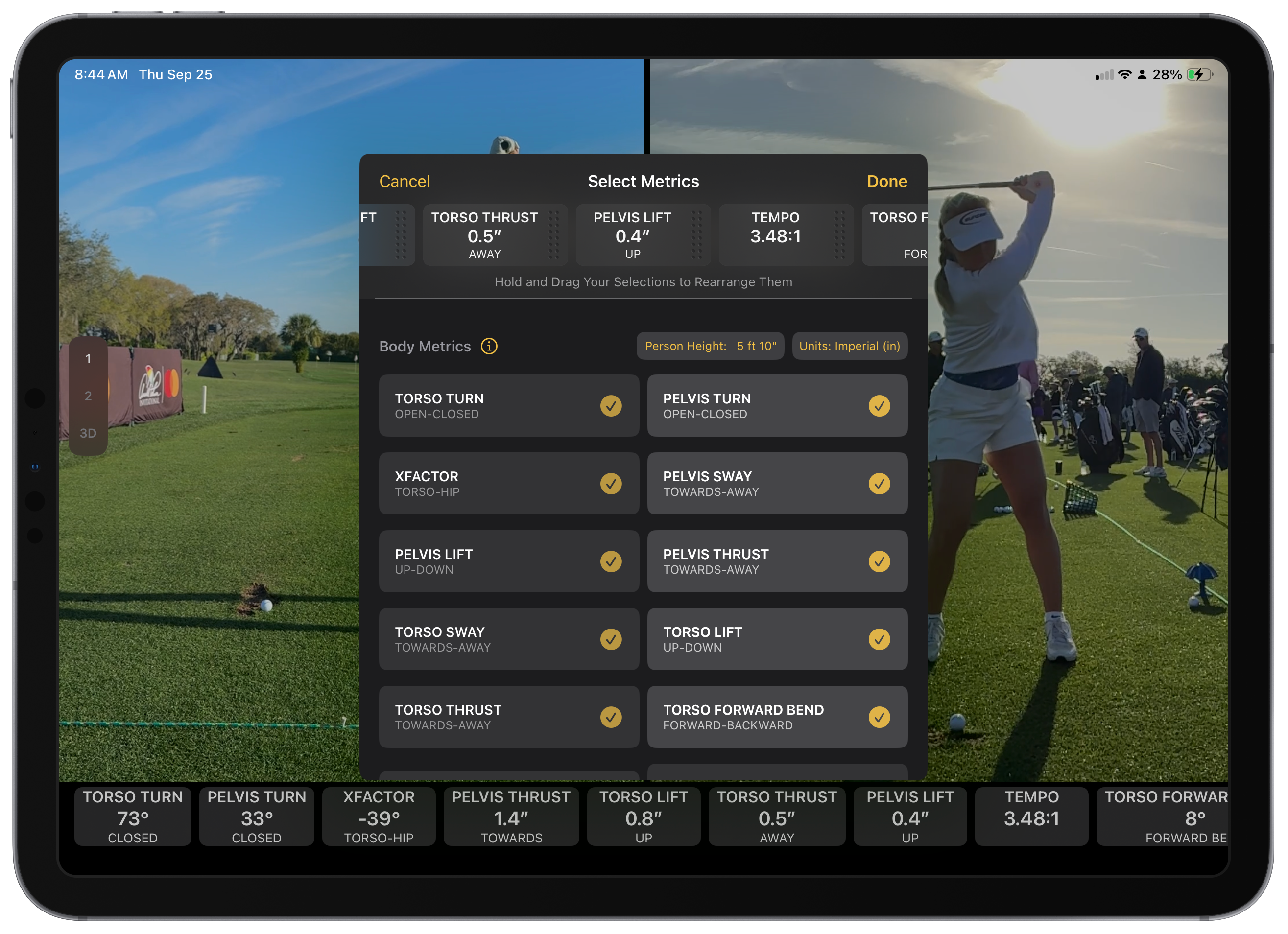 After calculating 3D data by selecting the 3D angle in the camera view, the user is presented with the data tiles for each metric at the bottom of the video player. Tapping on the metrics brings up a panel to manage which metrics are visible. You can also long press on a data tile and drag it to change the order that the metrics are displayed. In addition, the golfer's height and units for translational metrics like sway can also be selected. Note that the metrics are only displayed only for coaches at this time.