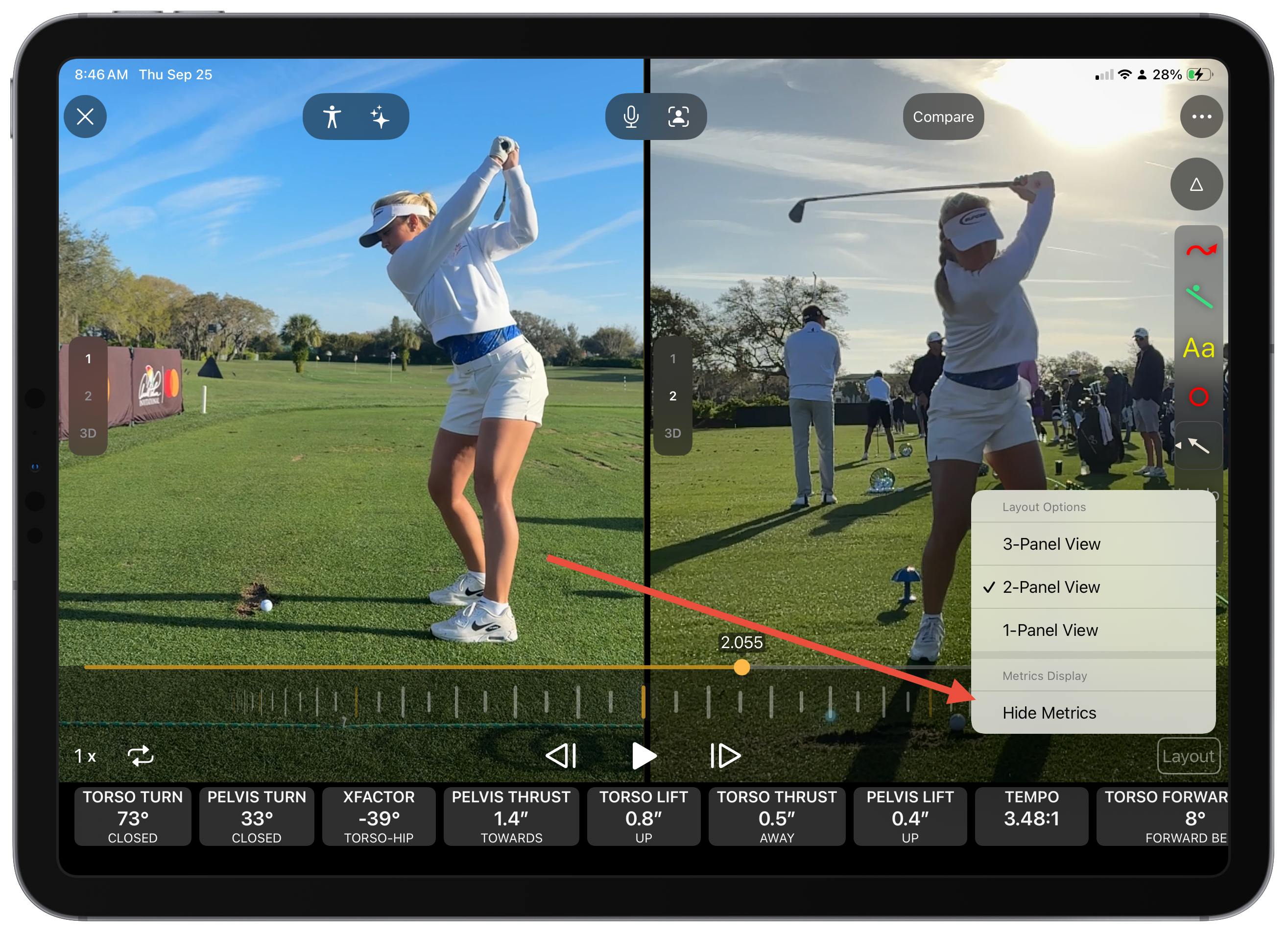 If you would prefer not to show the metrics at all, tap the 'Layout' button in the lower right corner of the video. Students / clients will not have access to computing the metrics and will only see them if you include metrics in a shared voiceover recording.