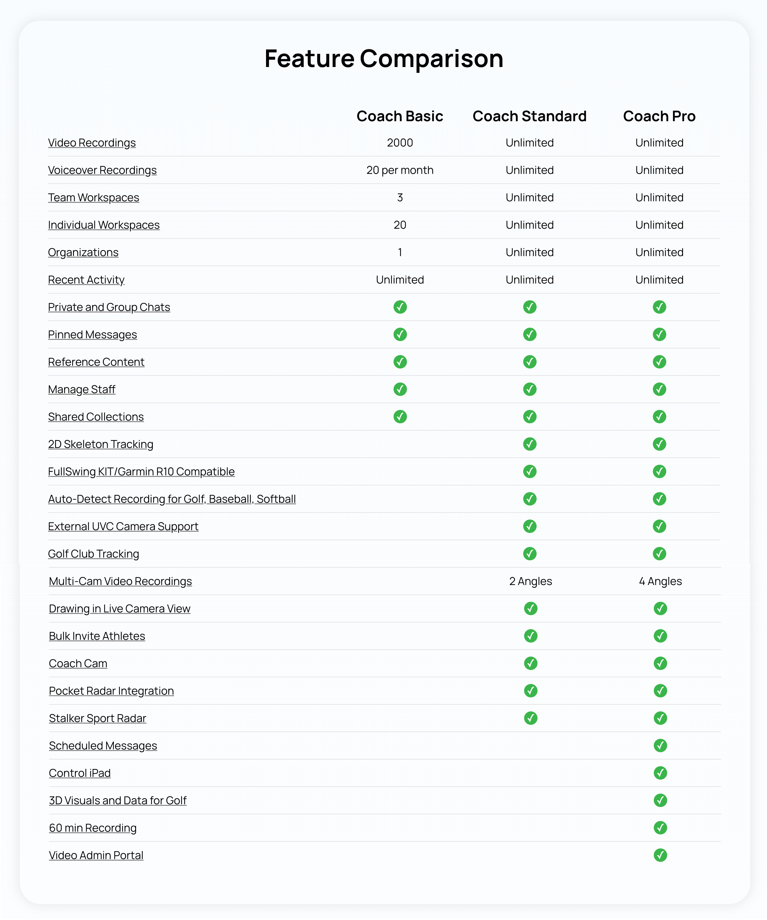 You’ll keep core features, but some advanced tools will move to Coach Pro (e.g., 3D, 4 angle multi-cam, advanced messaging options like scheduled messages and 60 minute recordings). Be sure to check our comparison graphic.